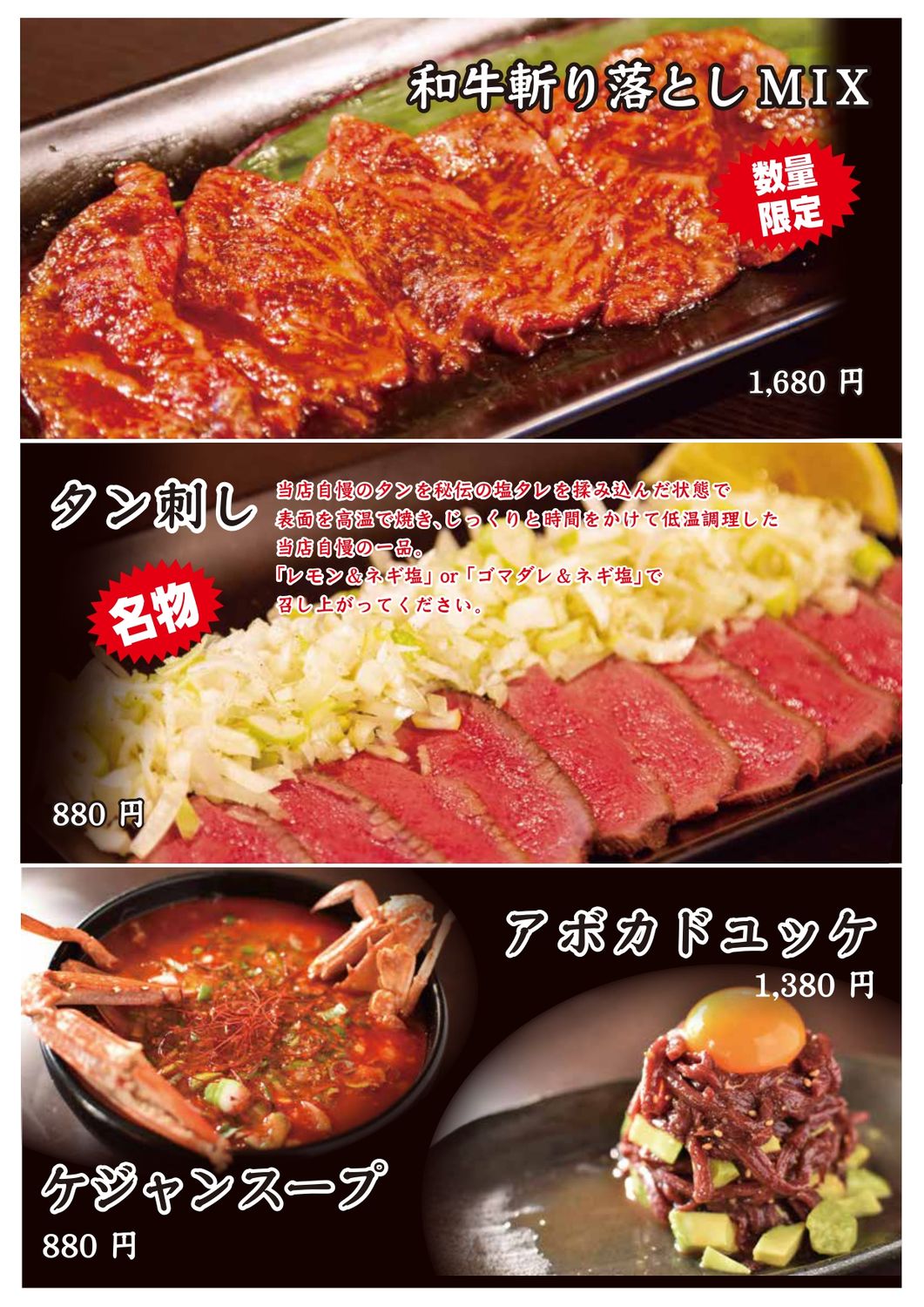 お店のイチオシメニューとして、まず挙げられるのが上タン塩です。厳選した新鮮なお肉をご用意しているので、絶妙な食感とお肉の旨みをご堪能できます。次にお店の大人気メニューとして挙げられるのが、ギャングスターカルビです。広大なアメリカの土地で栄養をしっかりとって育ったお肉なので味わい深く、食べ応えのあるお肉として好評です。